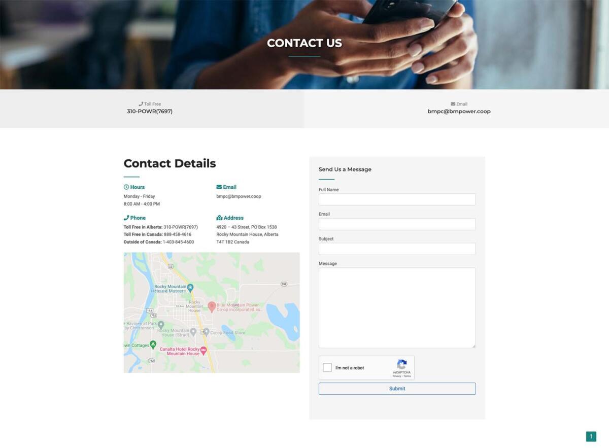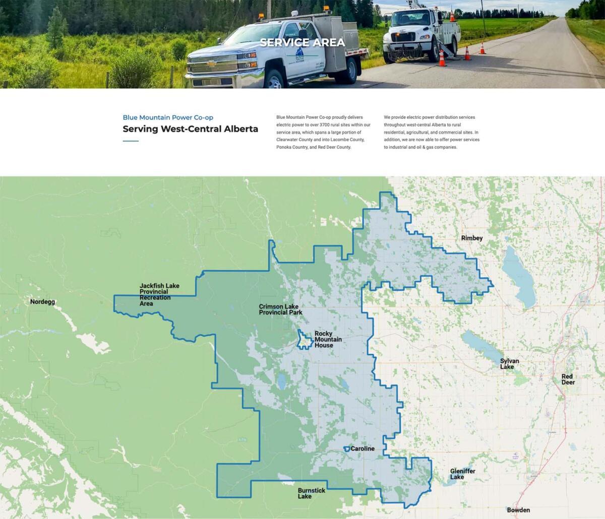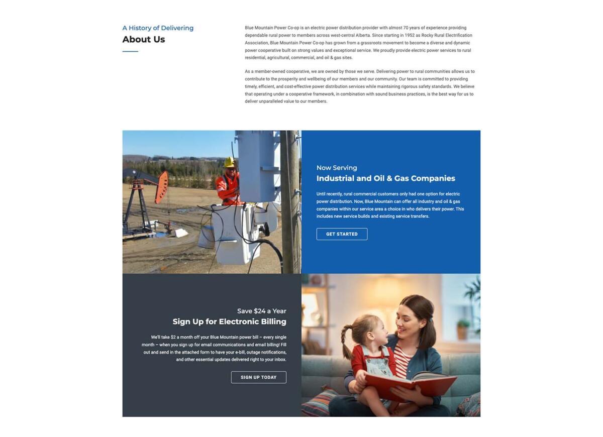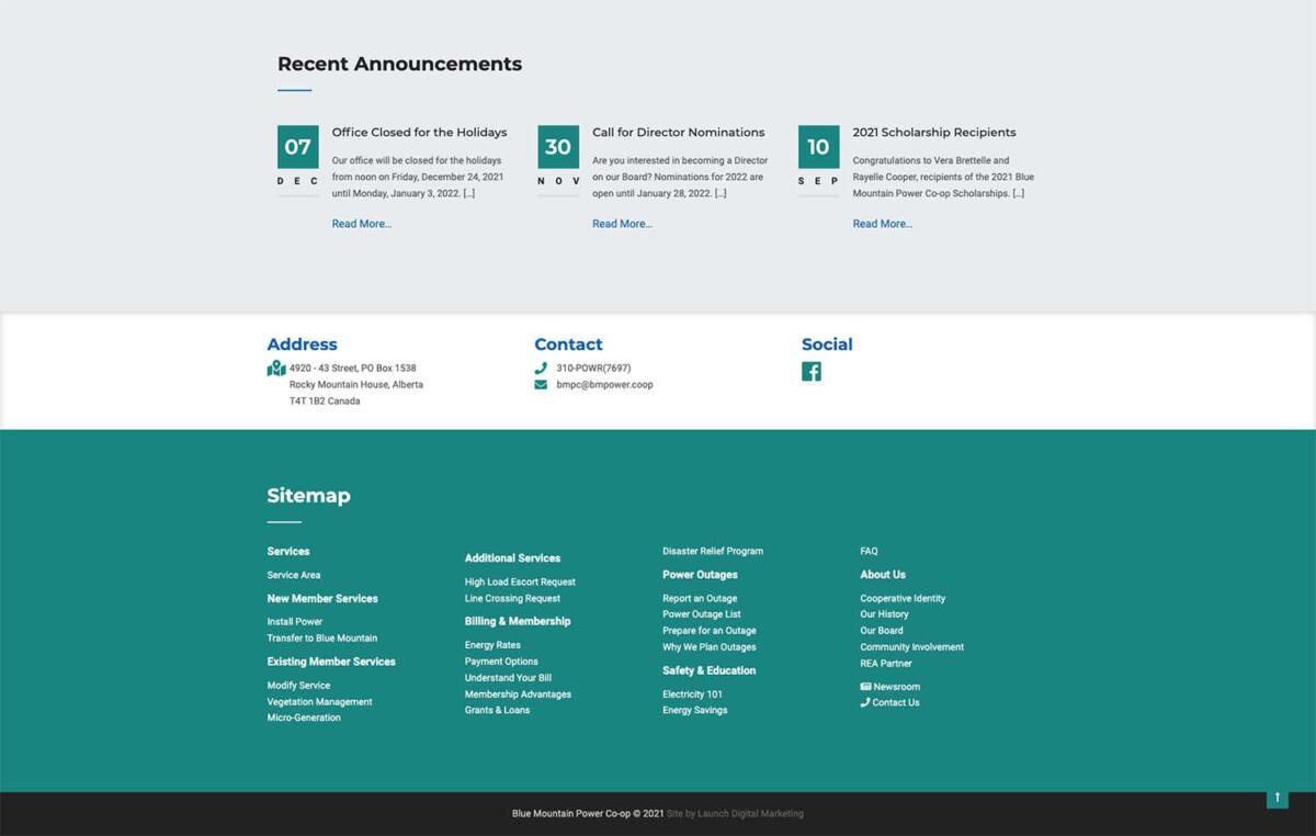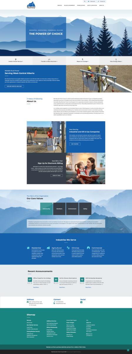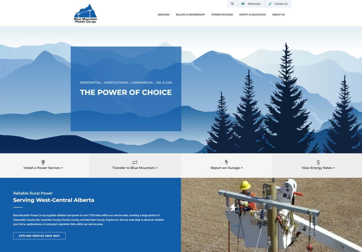 I worked with Blue Mountain Power Co-op (as developer/owner of Launch Digital Marketing) to develop a new website. Blue Mountain Power Co-op is a power service provider location in Rocky Mountain House, Alberta. The goal of the website was to help expand their services, reach new clients, and provide a more efficient avenue for sharing information.