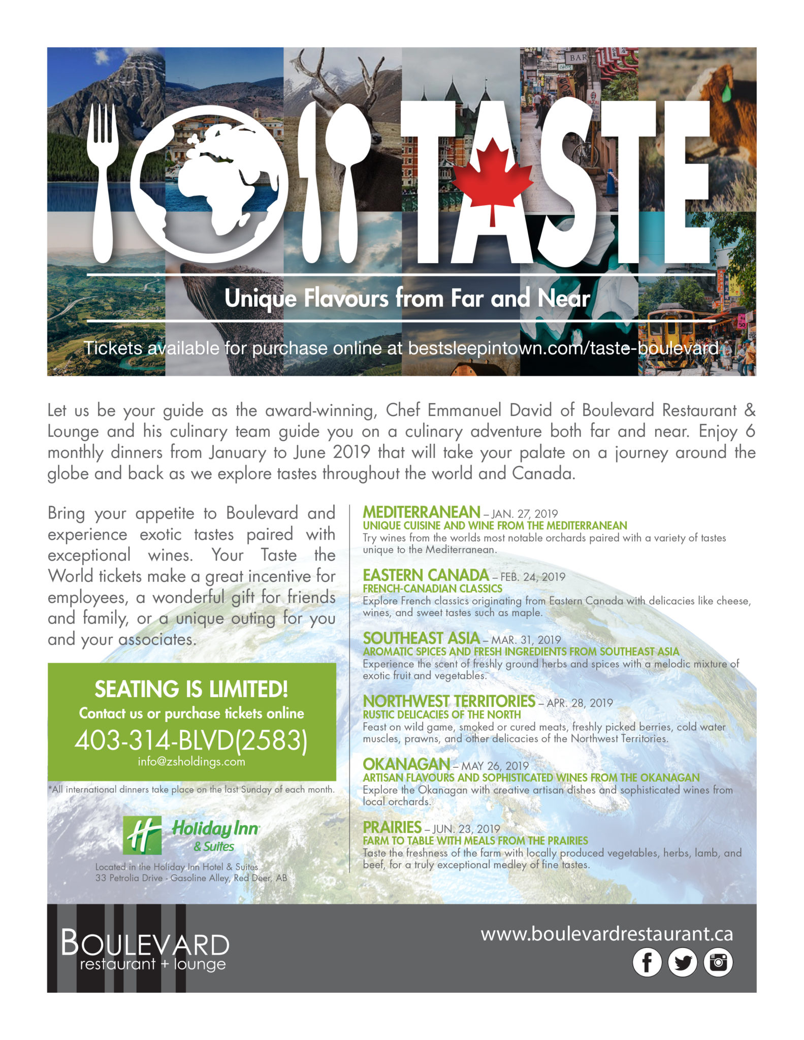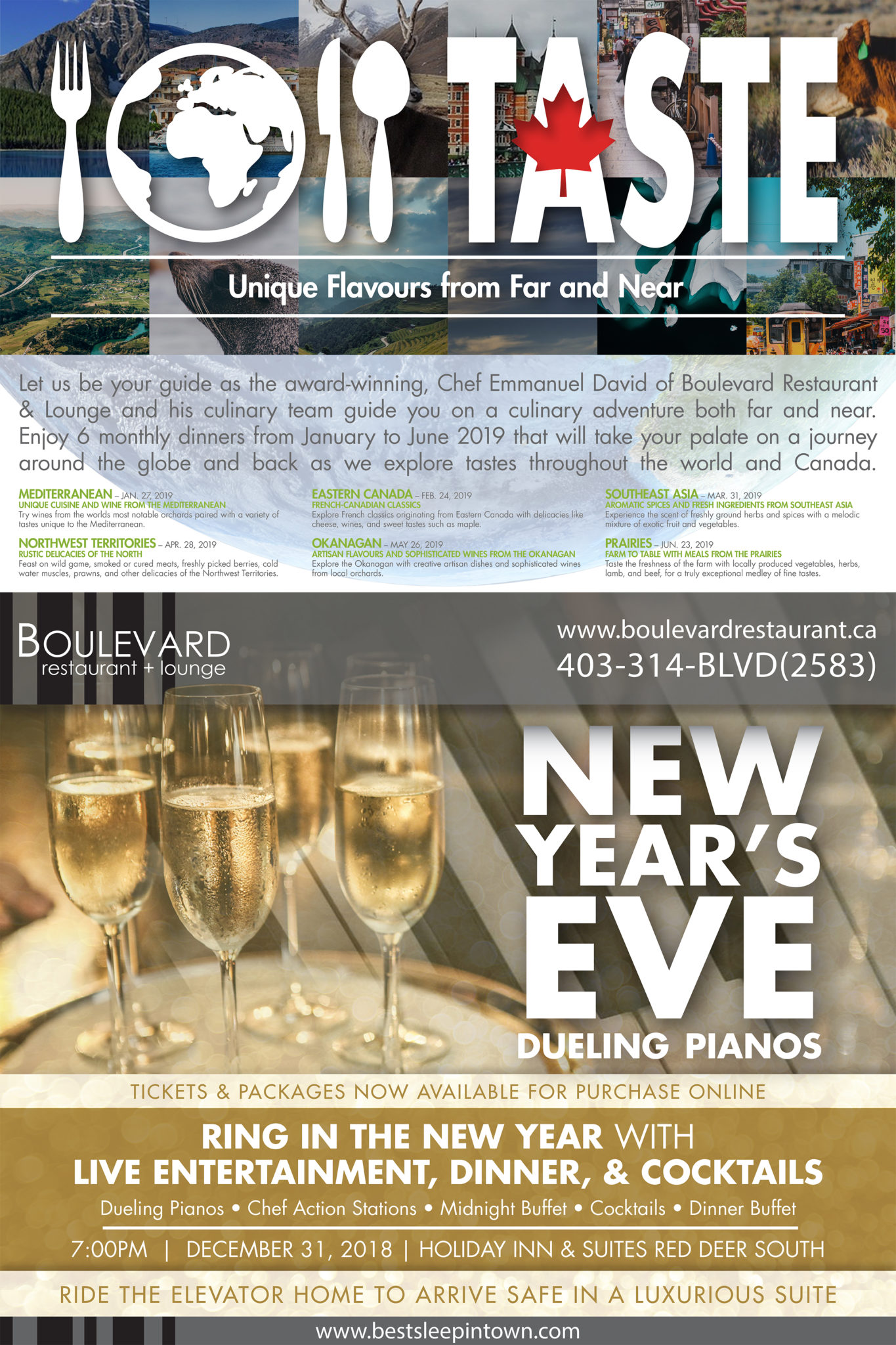 I have created numerous posters and print designs to advertise events like Taste the World and New Year’s Eve Dueling Pianos for Boulevard Restaurant and Greentree Restaurant, owned and operated by ZS Holdings.