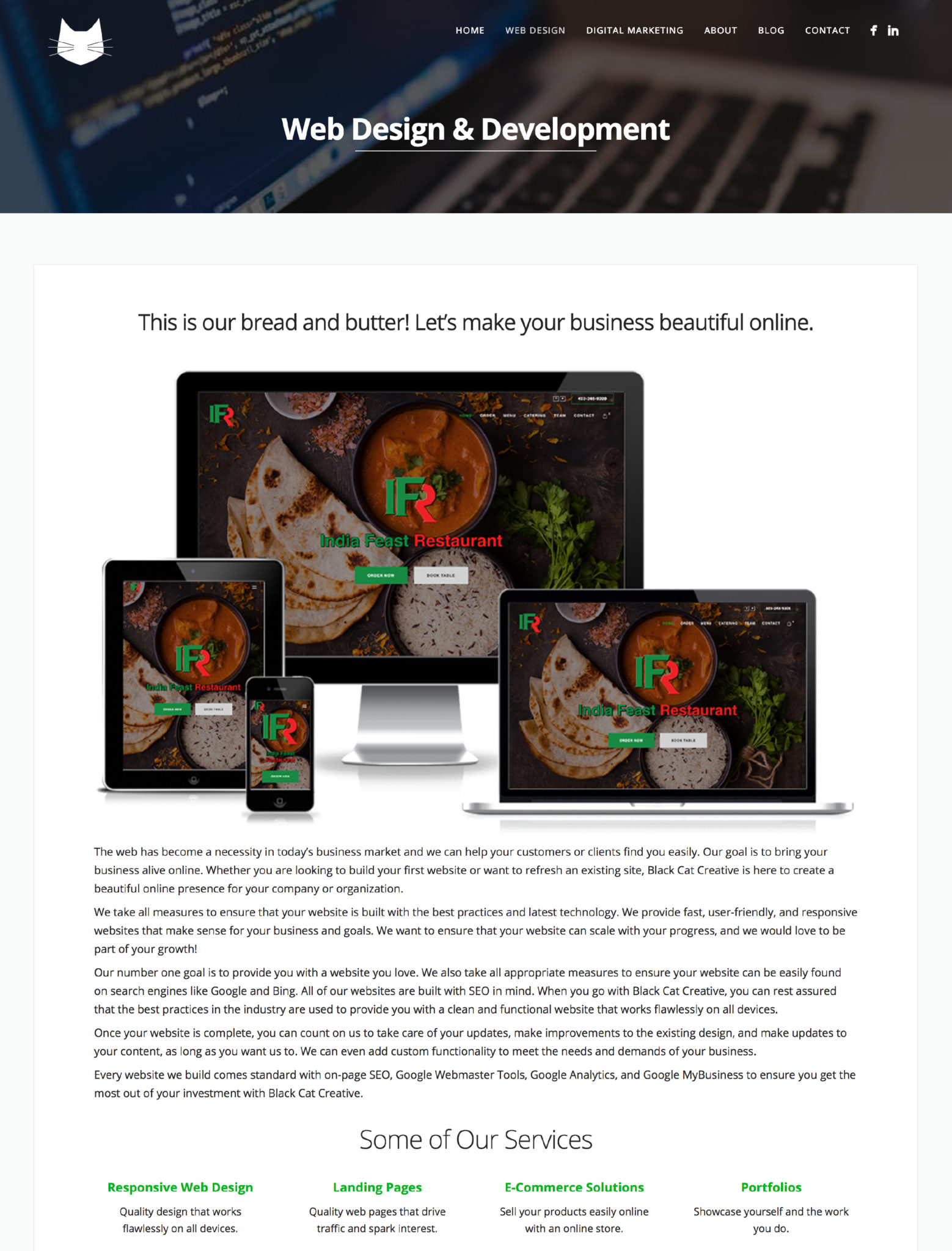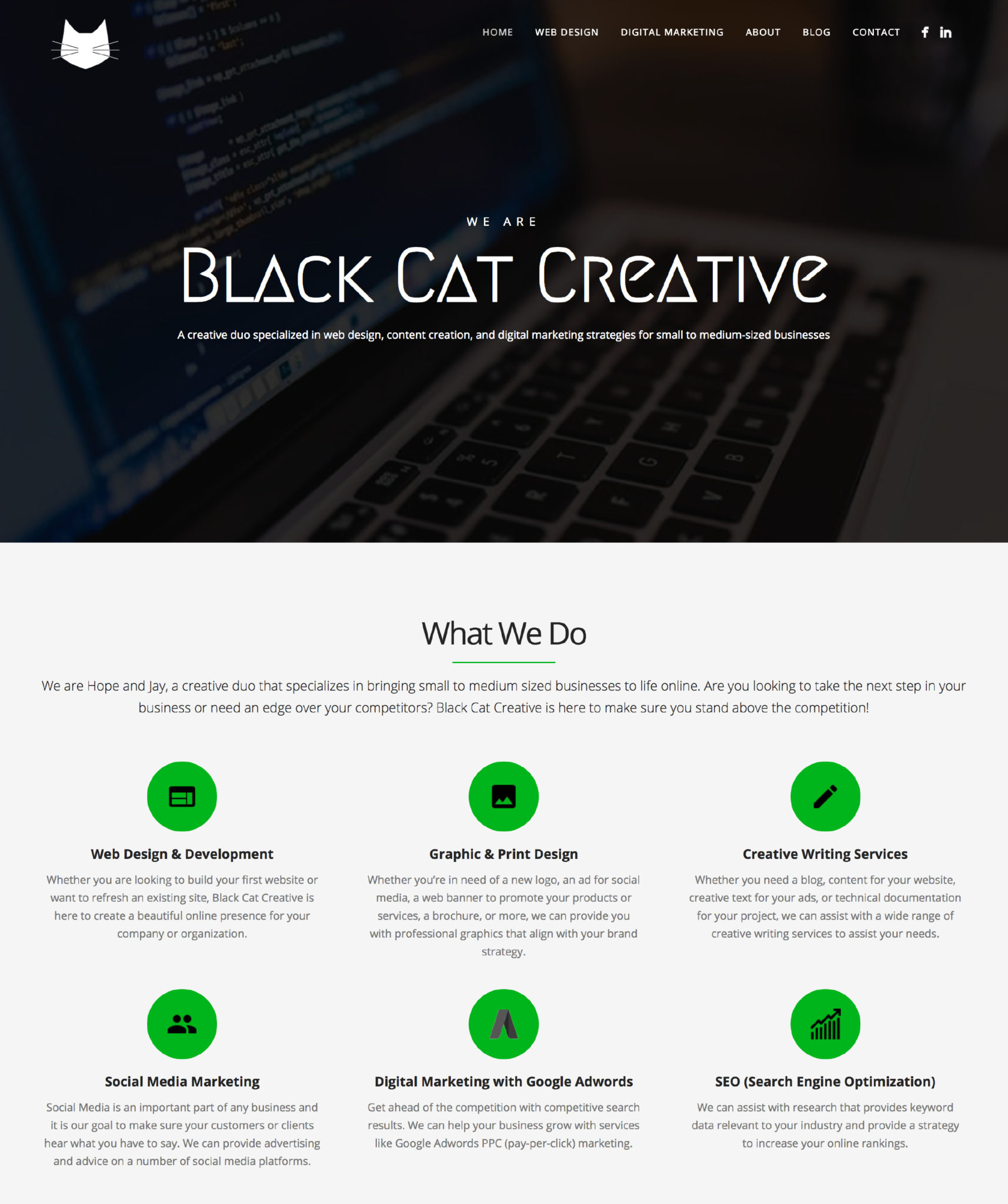 Black Cat Creative was put together as a place to showcase work done in collaboration with my wife, Hope Gervais. We both work in marketing and complement each other with contrasting skills. I developed the websites and designs and she created the content and general direction for the projects we worked on together. Together we have completed a few websites and designs, so I put together this simple portfolio-based website to showcase what we have done.